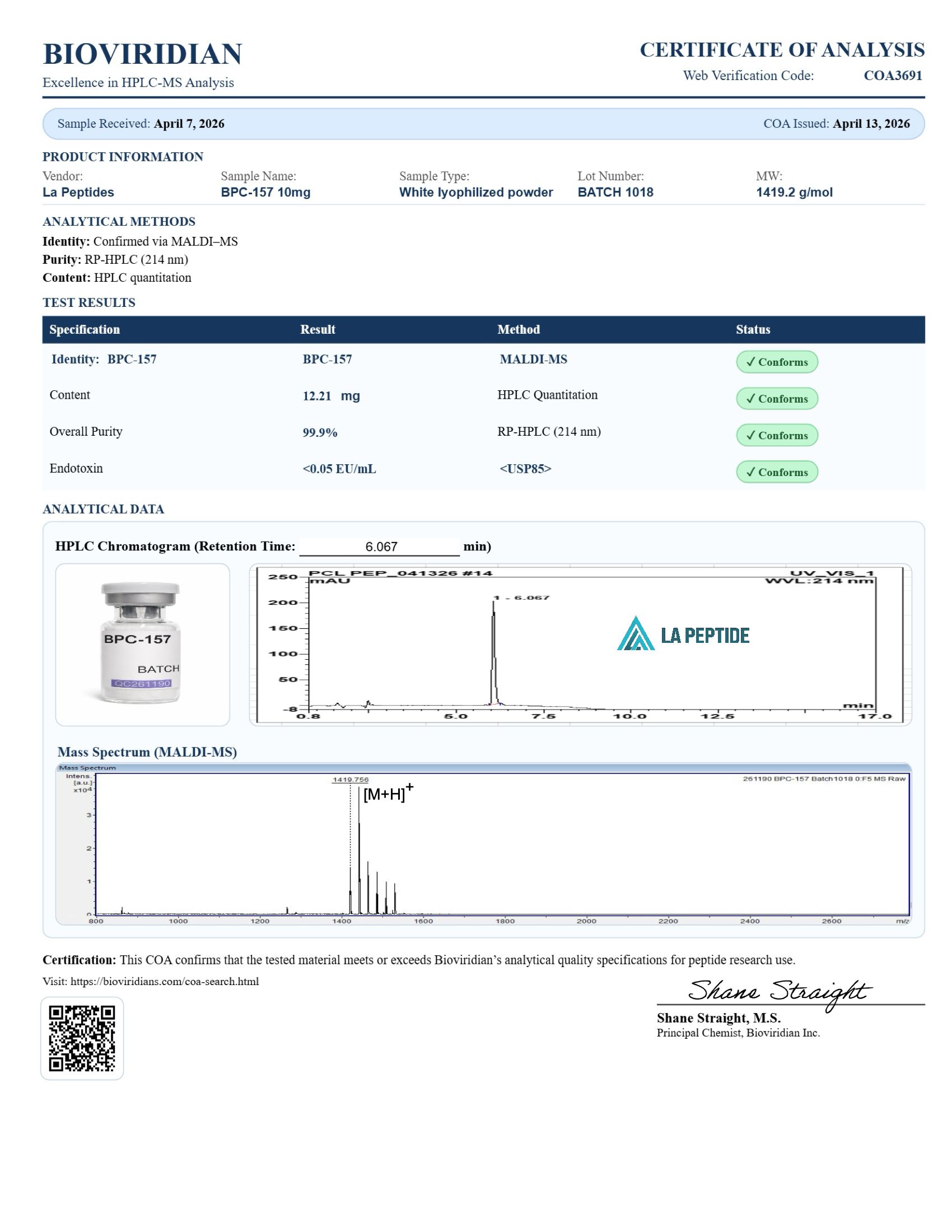 BPC-157 is a synthetic pentadecapeptide derived from a protective protein found in the gastric mucosa. Structurally stable and water-soluble, it is widely studied for its potential role in cellular signaling, tissue regeneration, and inflammation models. BPC-157 is intended solely for laboratory and in vitro research purposes.