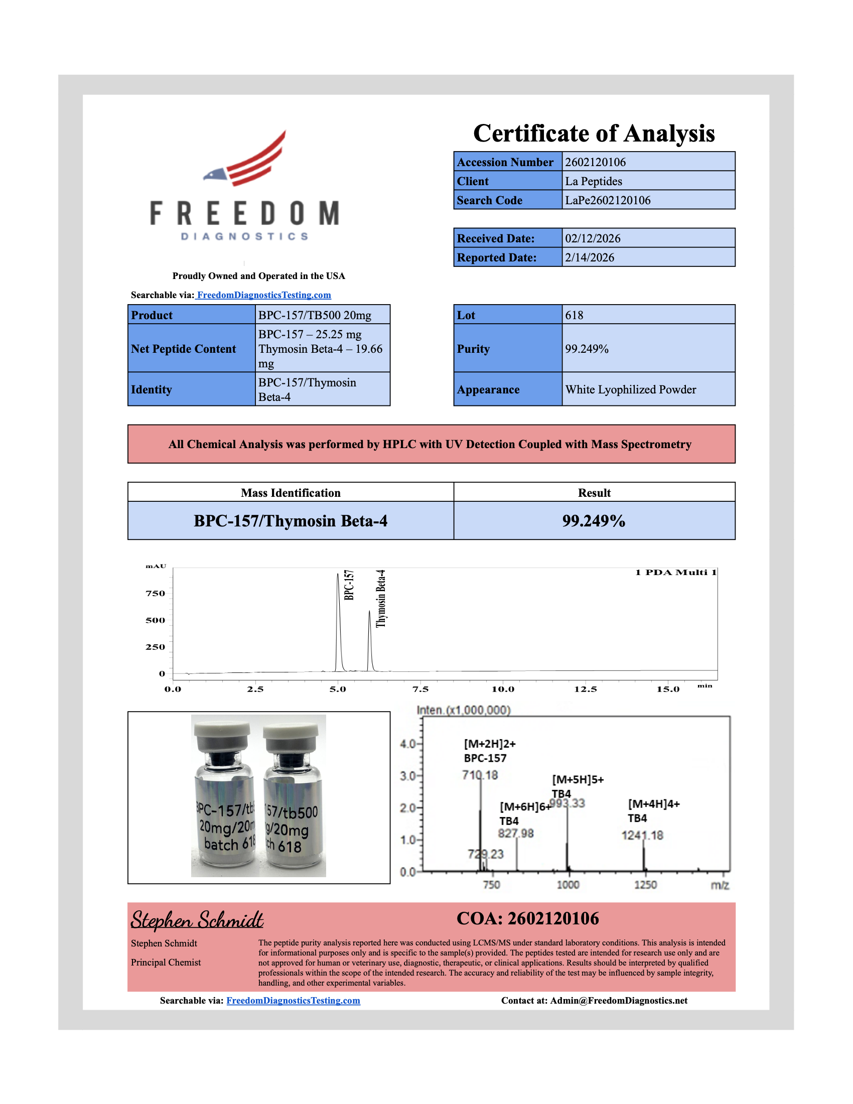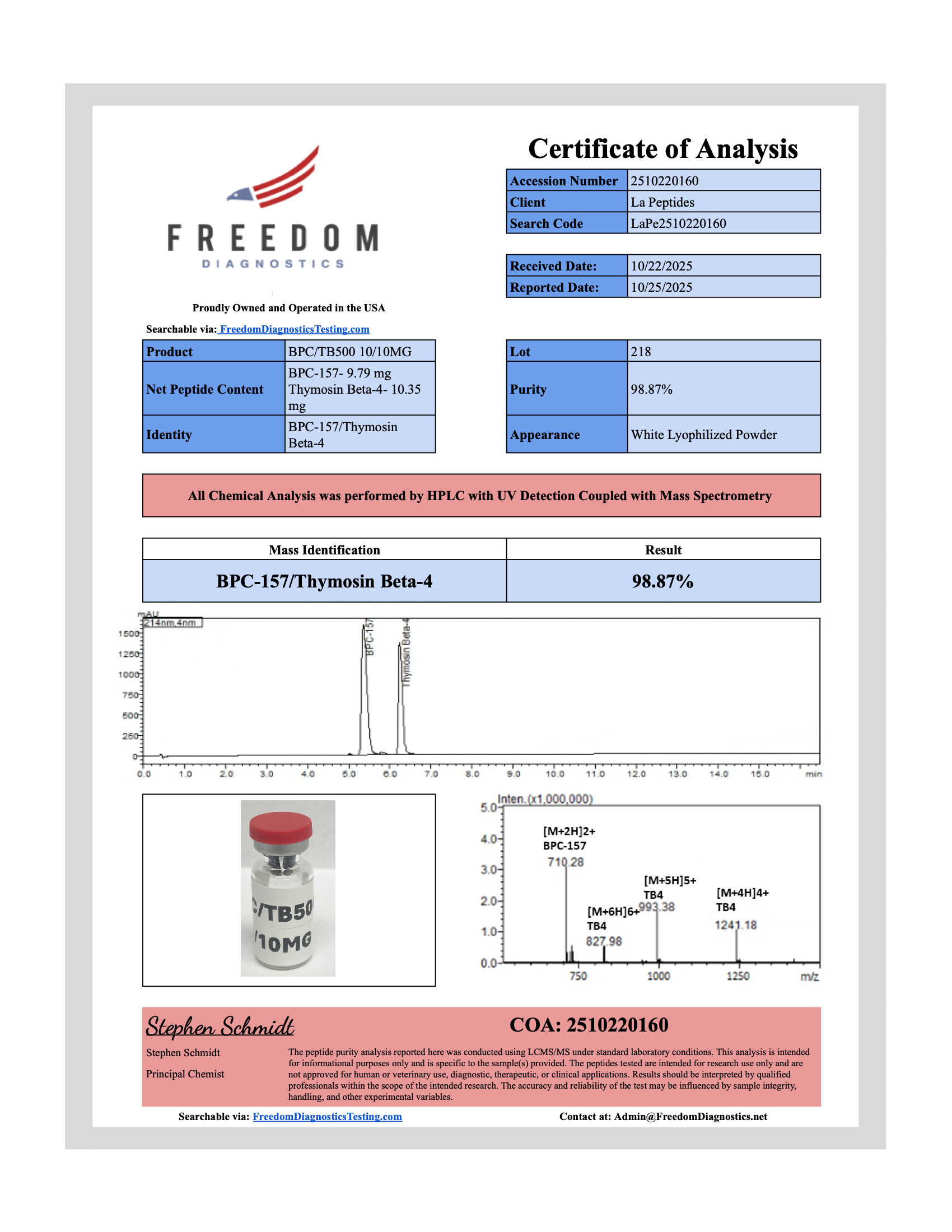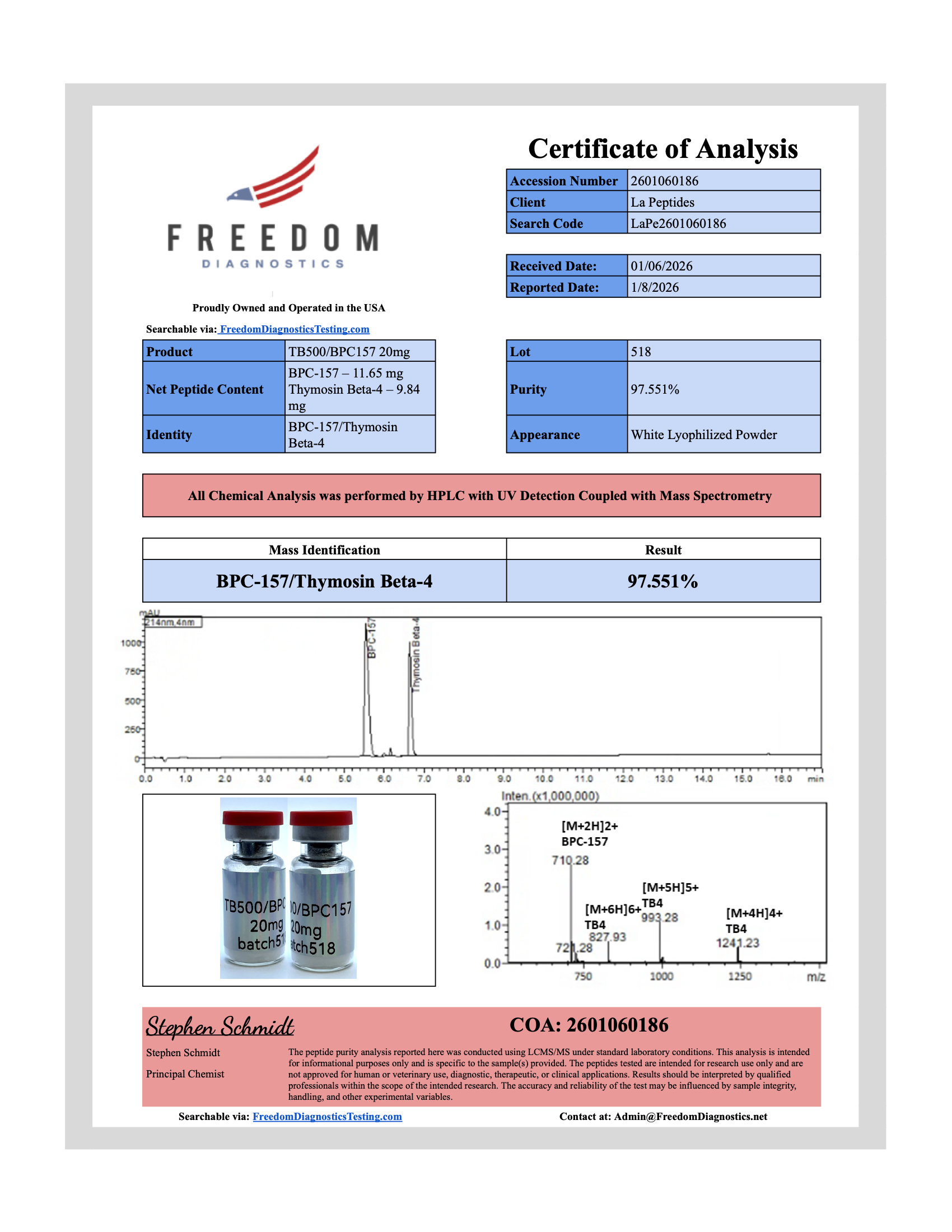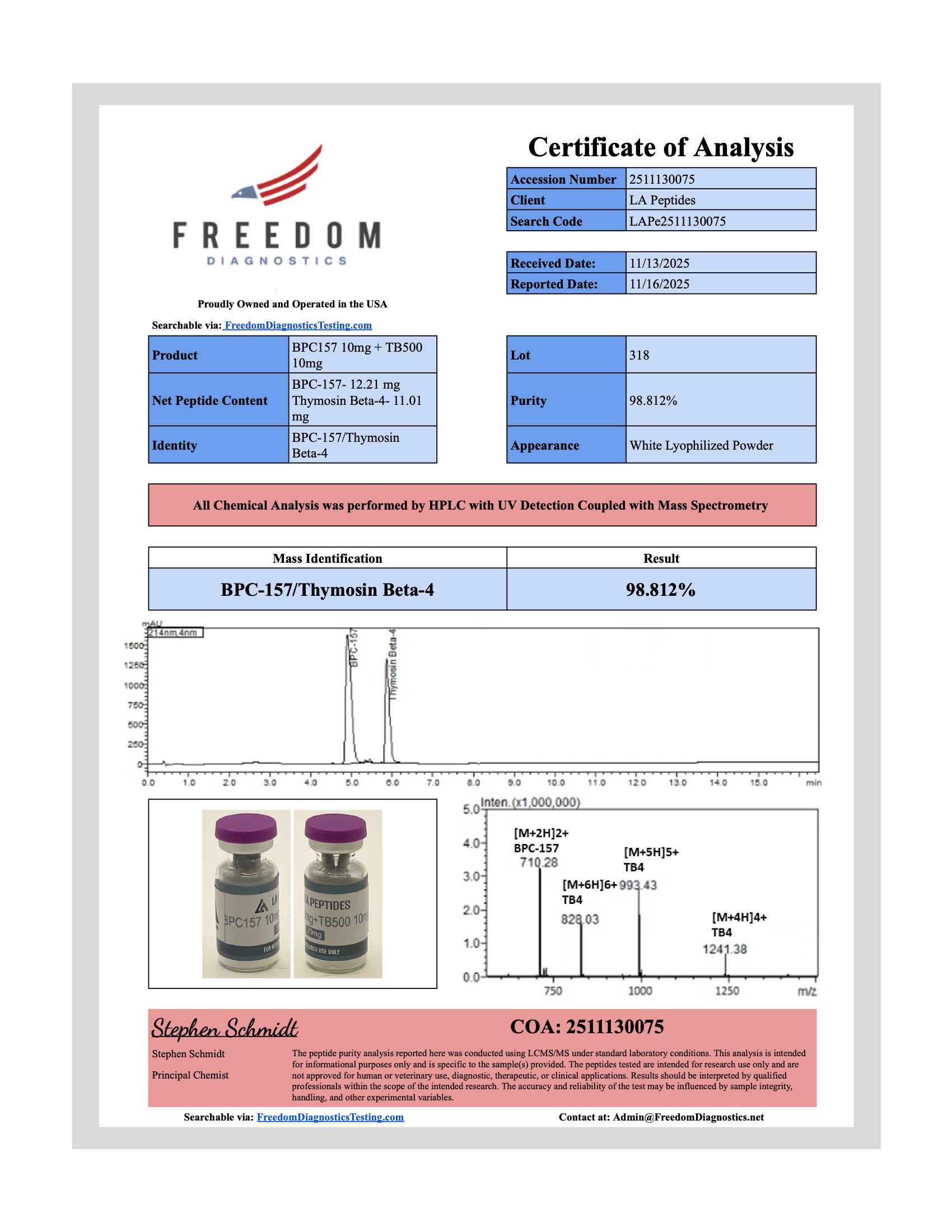 This research-only blend combines BPC-157 and TB-500, two synthetic peptides studied for their roles in tissue regeneration, cellular repair, angiogenesis, and inflammation modulation. The synergistic activity of these peptides supports their investigation across diverse biological models involving injury, oxidative stress, and vascular function. For controlled laboratory use only.