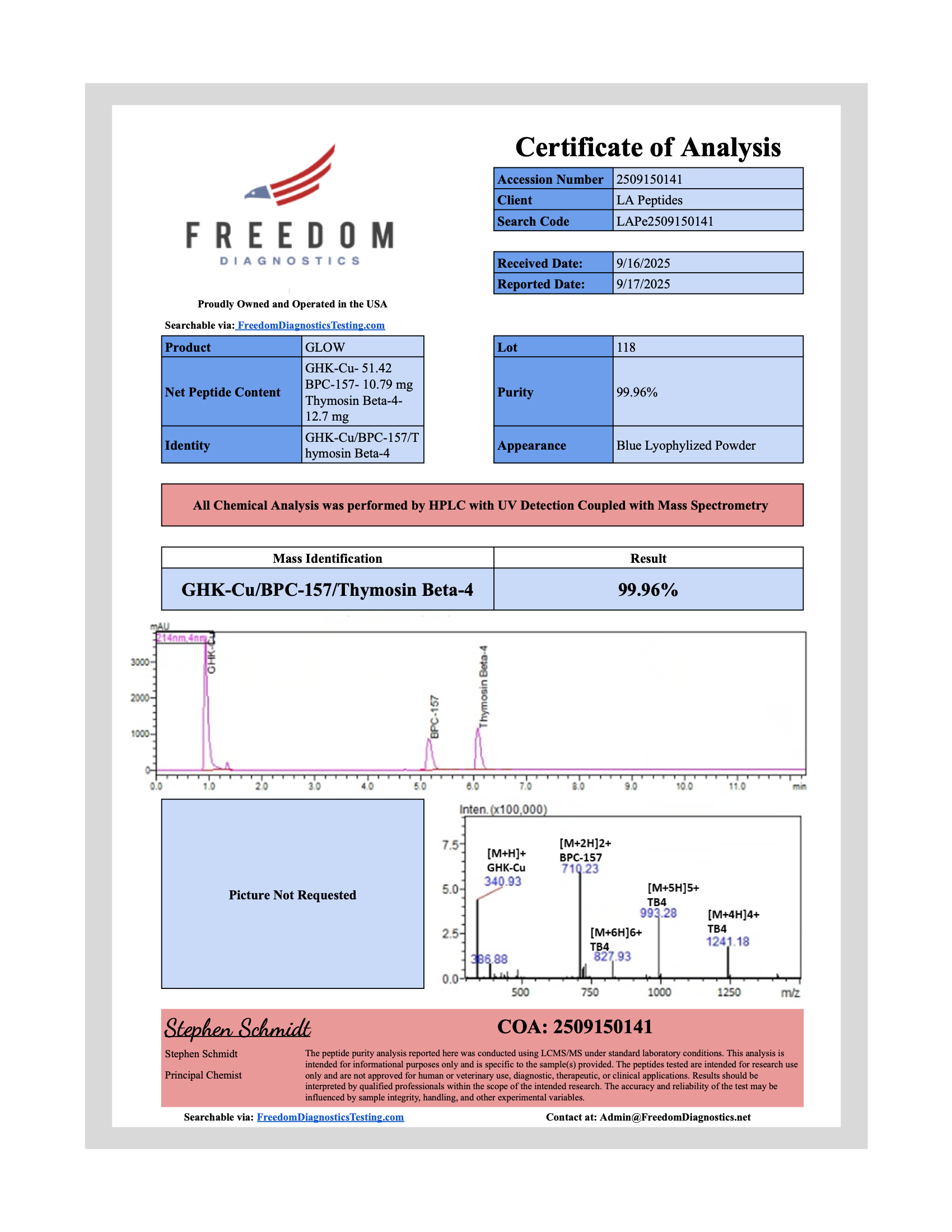 GLOW is a proprietary multi-peptide research blend composed of GHK-Cu (50MG), BPC-157 (5MG), and TB-500 (10MG), formulated for synergistic in vitro and in vivo study of cellular signaling, tissue regeneration, angiogenesis, and peptide-receptor interactions. This product is supplied as a lyophilized powder and is intended strictly for research purposes only.
