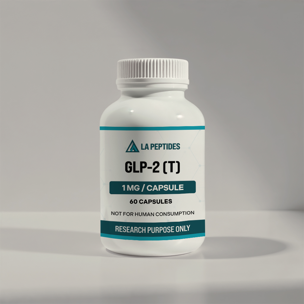 GLP-2 T is supplied in capsule form for research involving peptide structure, receptor interaction, and formulation analysis. Each bottle contains 60 capsules at 1 mg per capsule. This compound is intended strictly for laboratory research use only and is not for human or veterinary use.