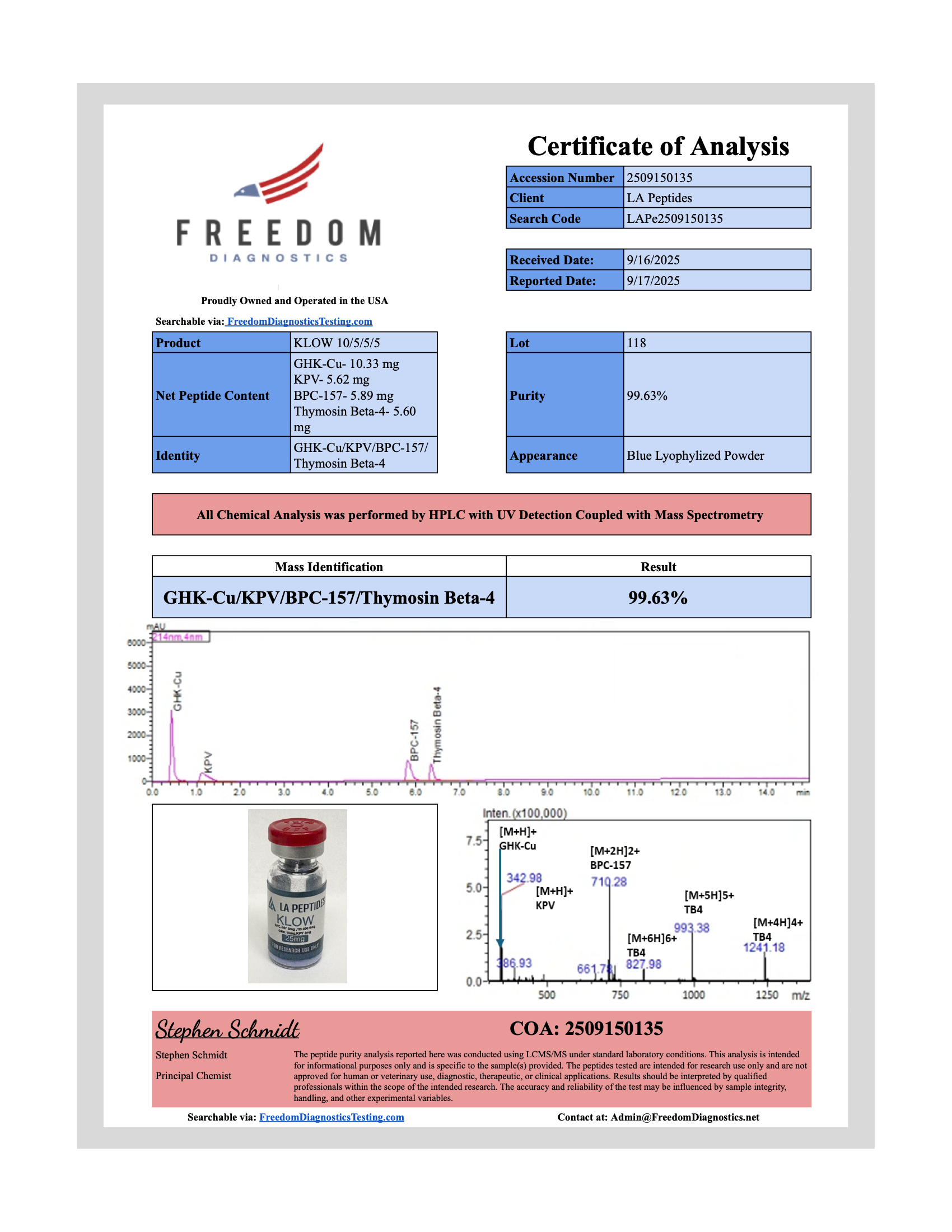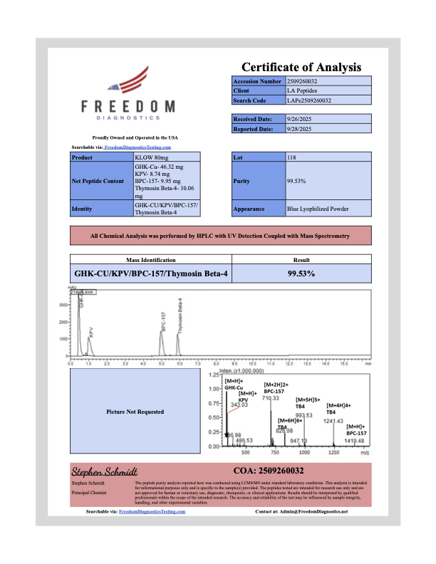 As a composite, KLOW allows single-run, side-by-side evaluation of endpoints tied to copper coordination chemistry, cytoskeletal regulation, peptide fragment biology, and general peptide structure–activity relationships. All usage is limited to laboratory research, with no claims of safety, efficacy, or human application inferred from these identifiers [1][2][3][4].