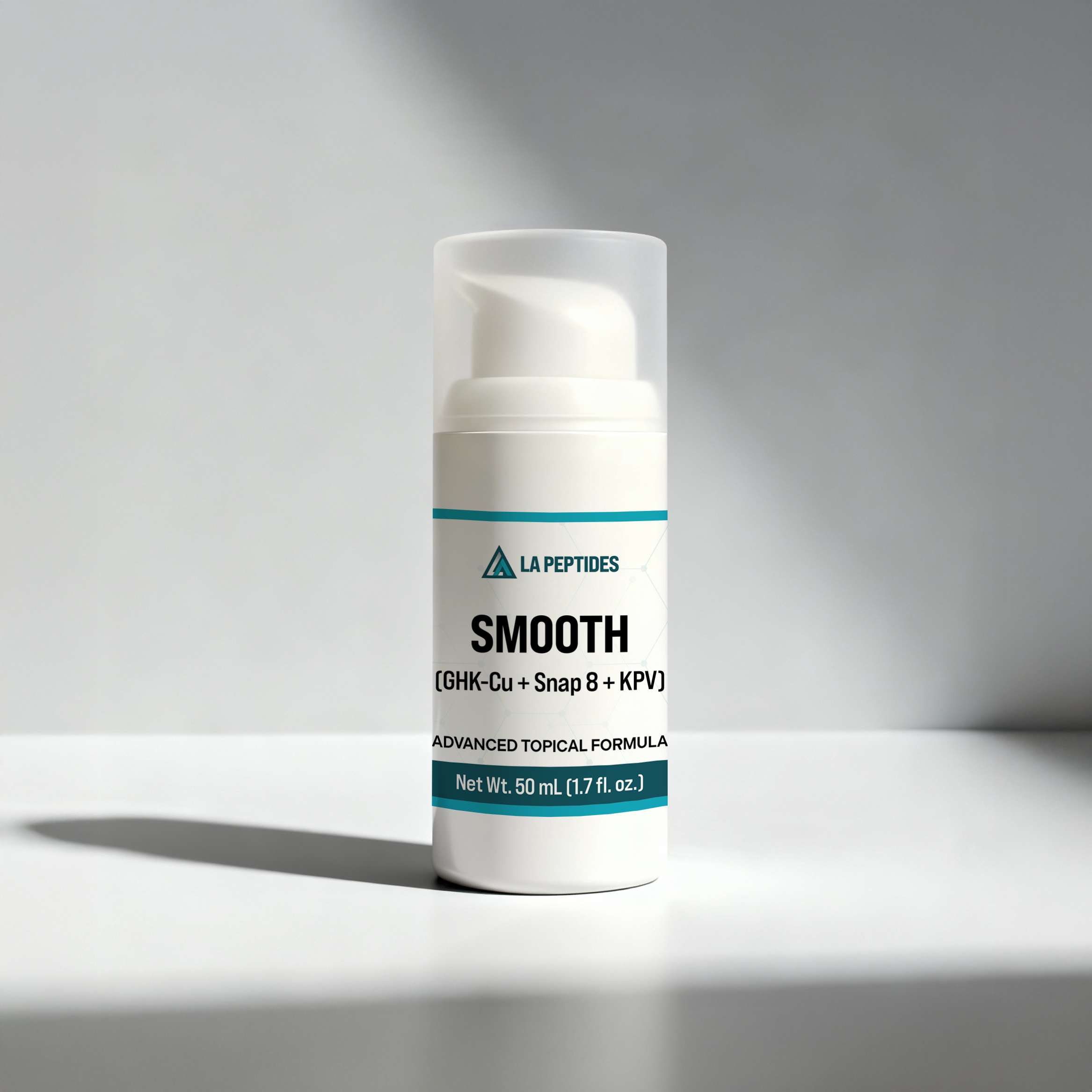 SMOOTH is a multi-peptide topical research lotion combining GHK-Cu, SNAP-8, and KPV. It is intended for in vitro and ex vivo models examining neuromuscular junction signaling, neuropeptide–SNARE interactions, copper-mediated matrix modulation, and pro-resolving inflammatory pathways at the skin interface.